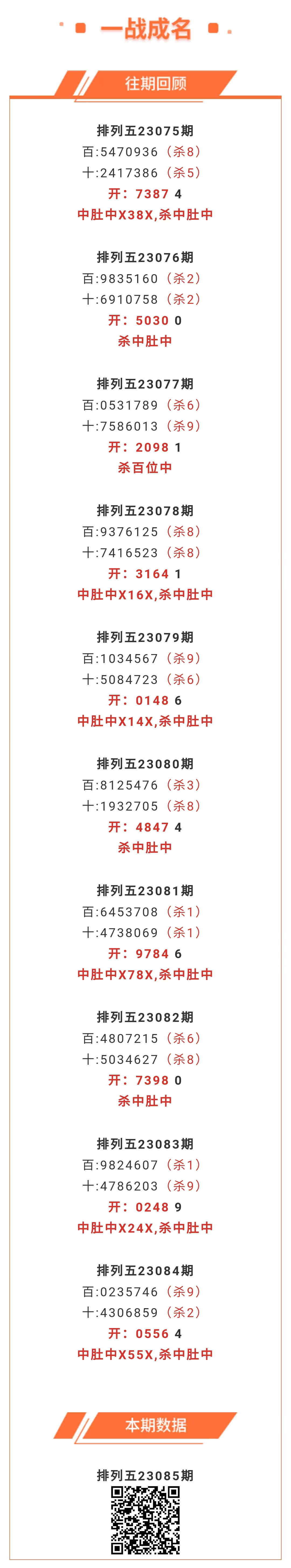 【排列五-085期】上期中肚中X55X,杀中肚中,中肚近10中6;本月圈中3次中肚!