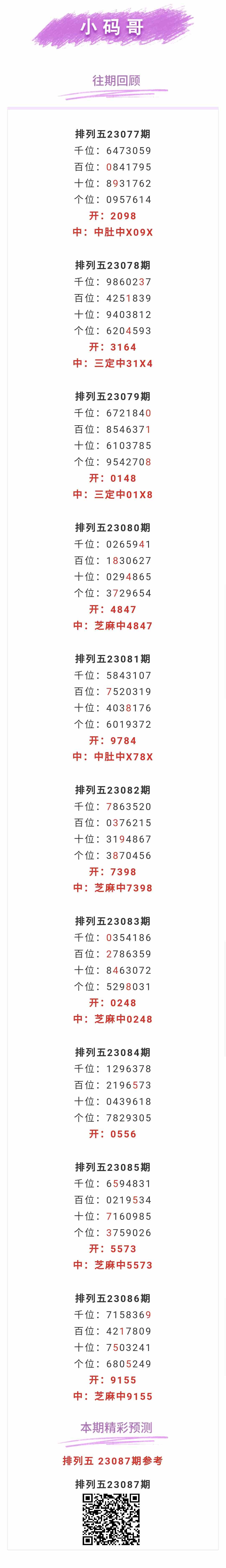 【排列五-087期】芝麻2连中!上期芝麻中9155,芝麻近10中5;本月圈中4次芝麻!