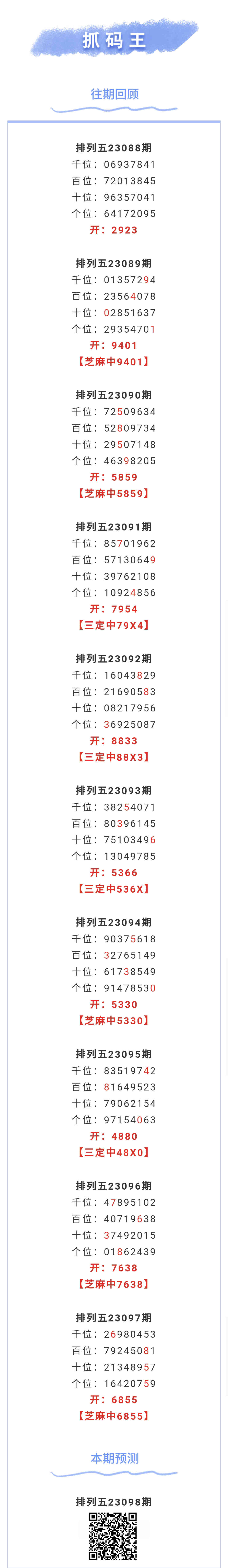 【排列五-098期】上期芝麻中6855,芝麻近10中5,本月圈中9次芝麻
