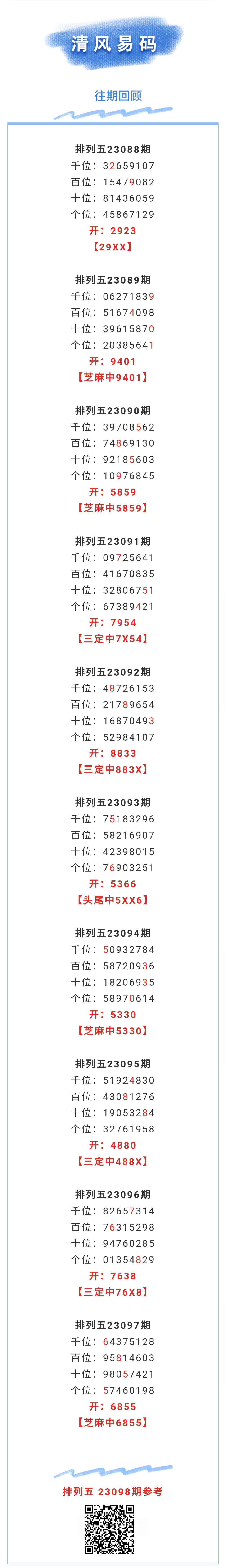 【排列五-098期】上期芝麻中6855,芝麻近10中4,本月圈中6次芝麻