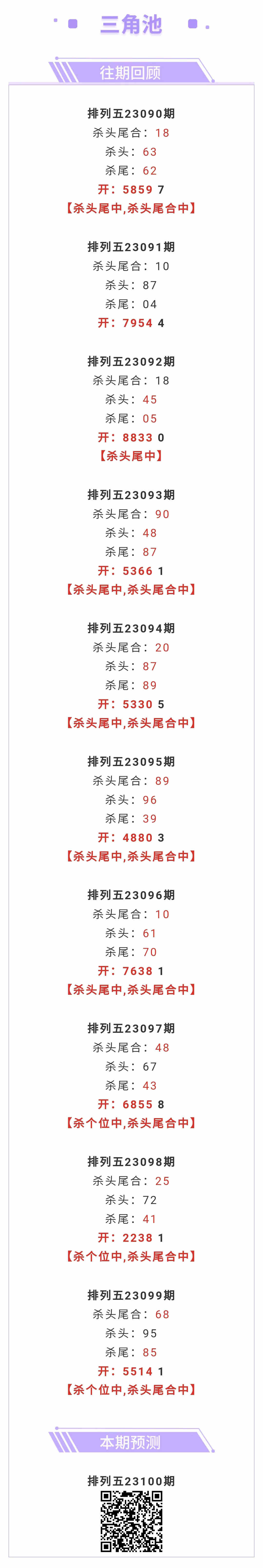 【排列五-100期】上期杀头尾合中,杀头尾合近10中8;本月圈中15次杀头尾合!