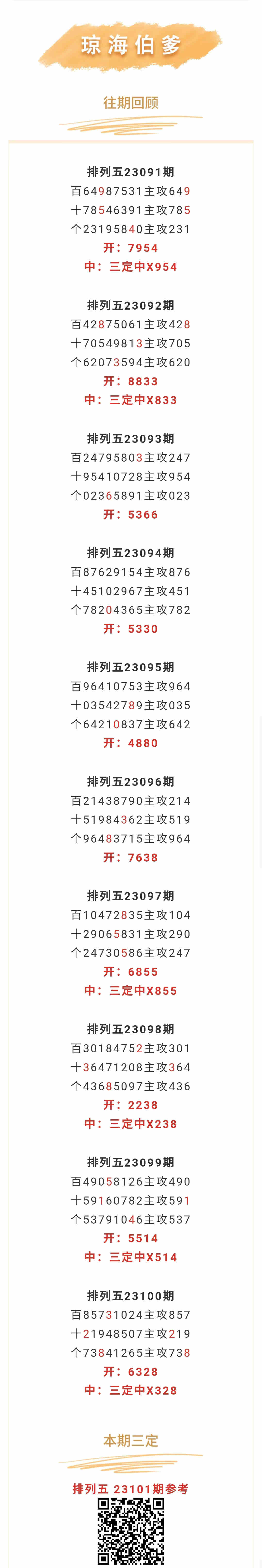【排列五-101期】上期三定中X328,三定近10中6,本月圈中10次三定!