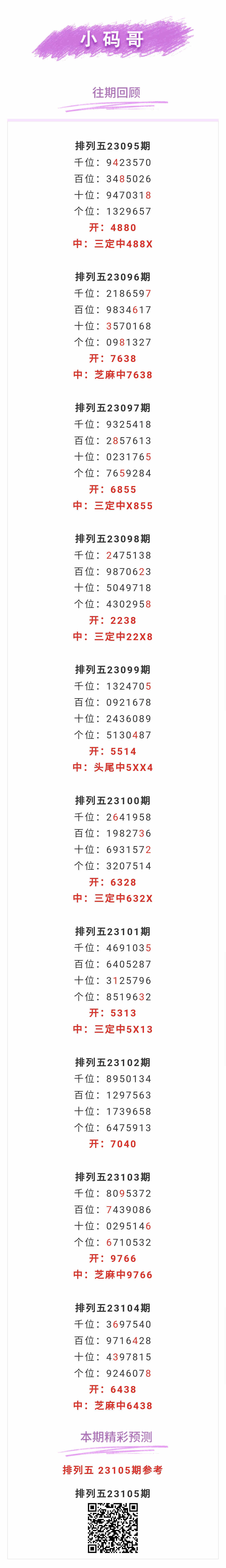 【排列五-105期】本月圈中7次芝麻,芝麻近10中3;上期芝麻中6438