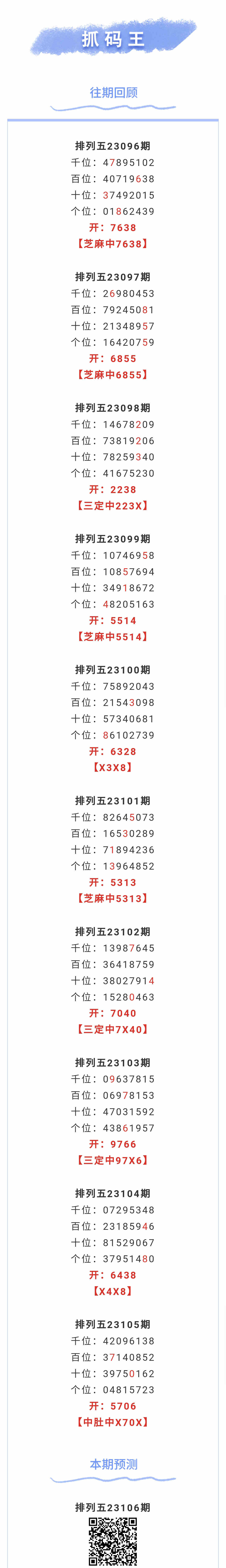 【排列五-106期】本月圈中11次芝麻,芝麻近10中4;上期中肚中X70X
