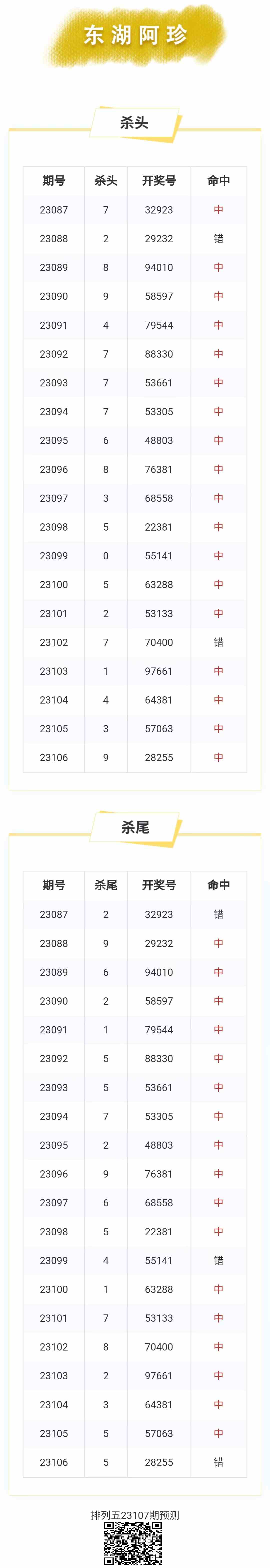 【排列五-107期】本月圈中21次杀头尾,杀头尾近10中7;上期杀千位中