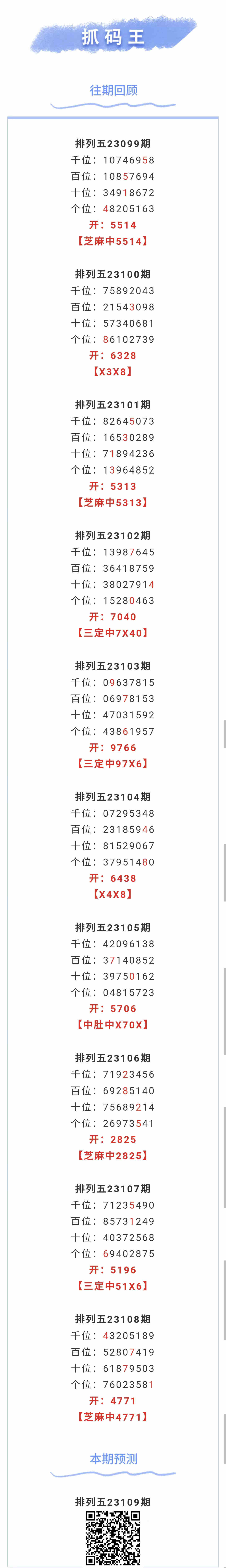 【排列五-109期】本月圈中13次芝麻,芝麻近10中4;上期芝麻中4771
