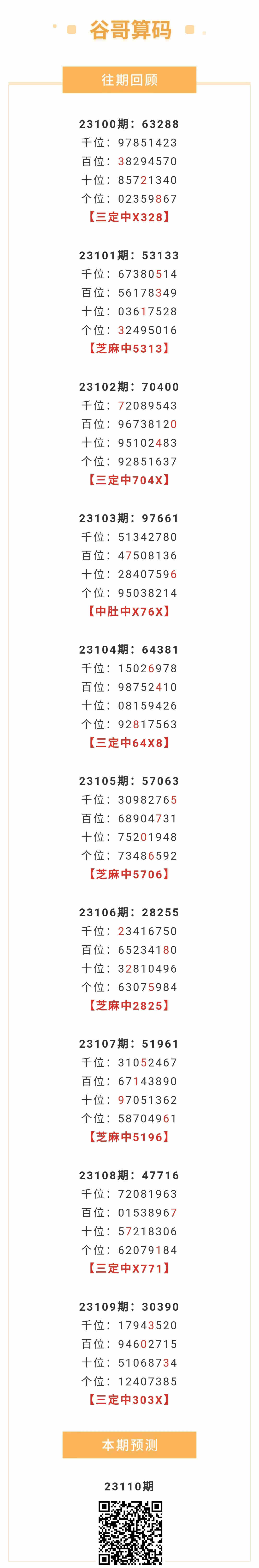 【排列五-110期】本月圈中13次芝麻,芝麻近10中4;上期三定中303X