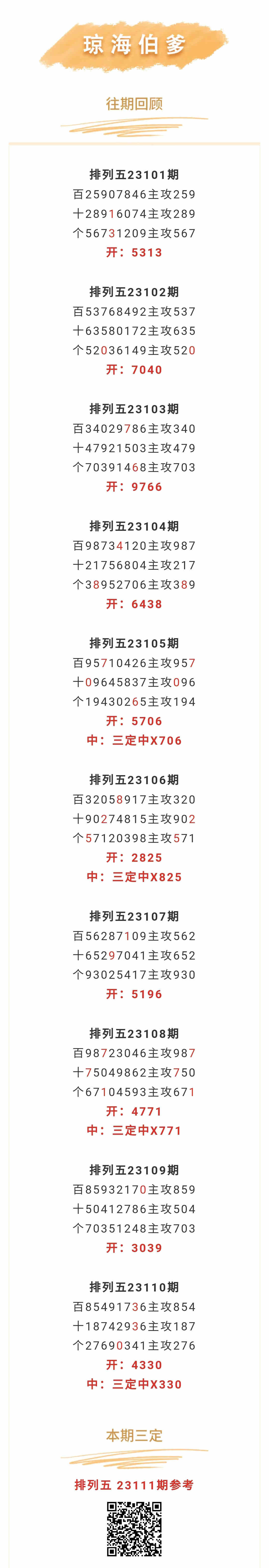 【排列五-111期】本月圈中1次三定,三定近10中4;上期三定中X330