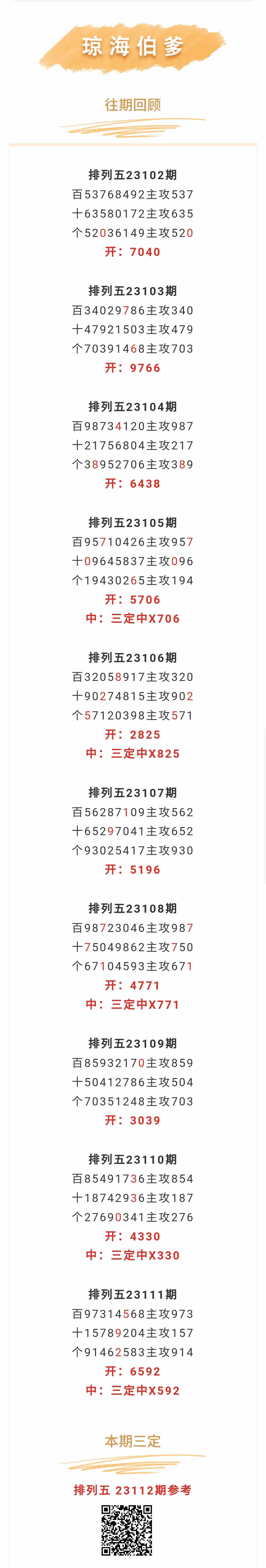 【排列五-112期】本月圈中1次三定,三定近10中5;上期三定中X592