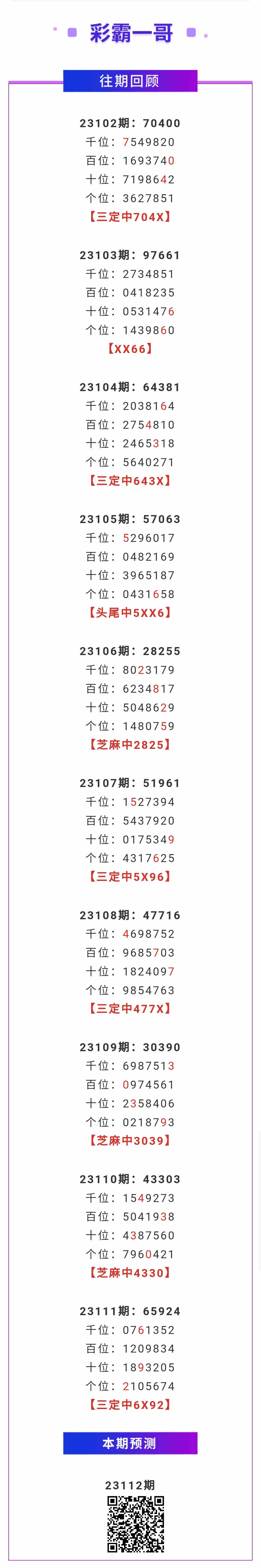 【排列五-112期】本月圈中0次芝麻,芝麻近10中3;上期三定中6X92