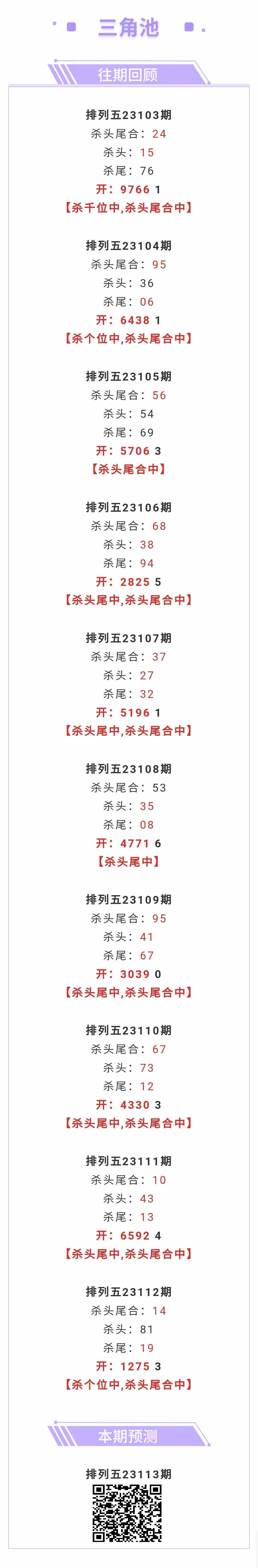 【排列五-113期】本月圈中2次杀头尾合,杀头尾合近10中9;上期杀杀头尾合中
