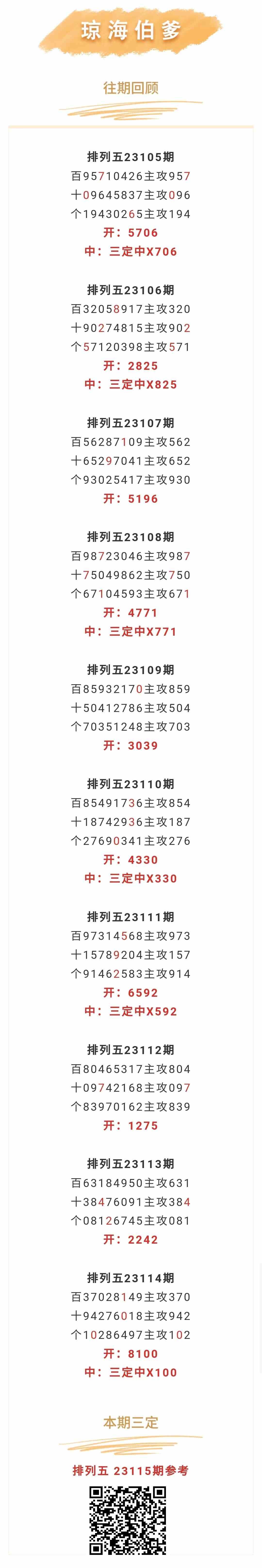 【排列五-115期】本月圈中2次三定,三定近10中6;上期三定中X100