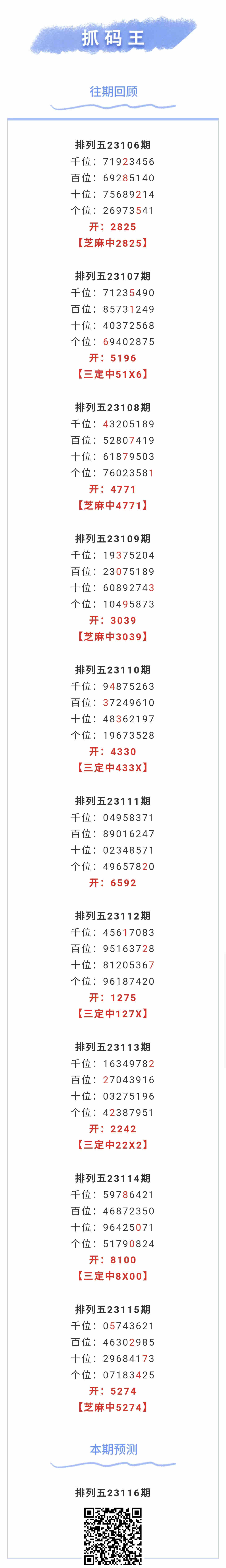 【排列五-116期】本月圈中1次芝麻,芝麻近10中4;上期芝麻中5274