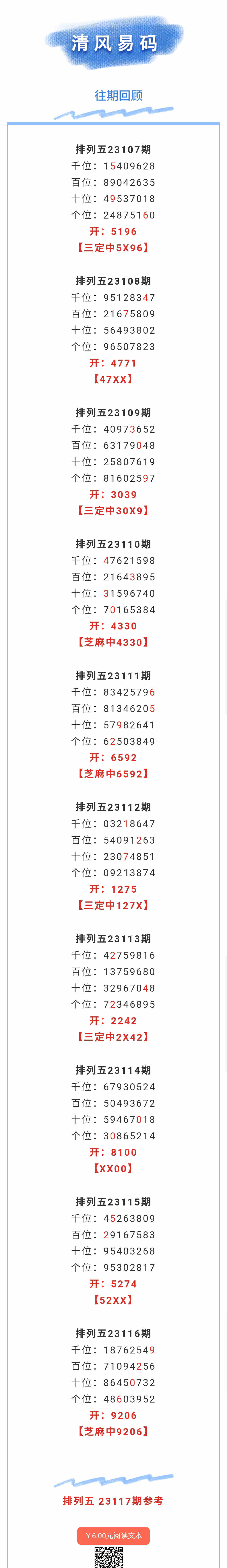 【排列五-117期】本月圈中2次芝麻,芝麻近10中3;上期芝麻中9206