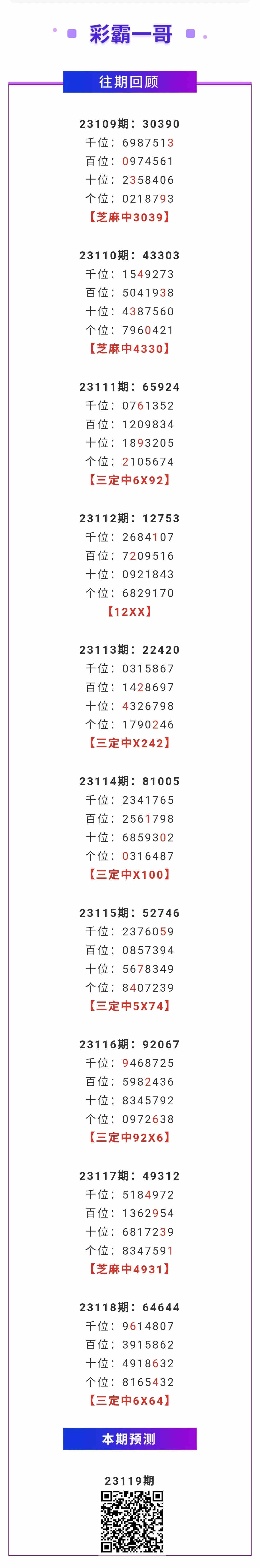 【排列五-119期】本月圈中1次芝麻,芝麻近10中3;上期三定中6X64
