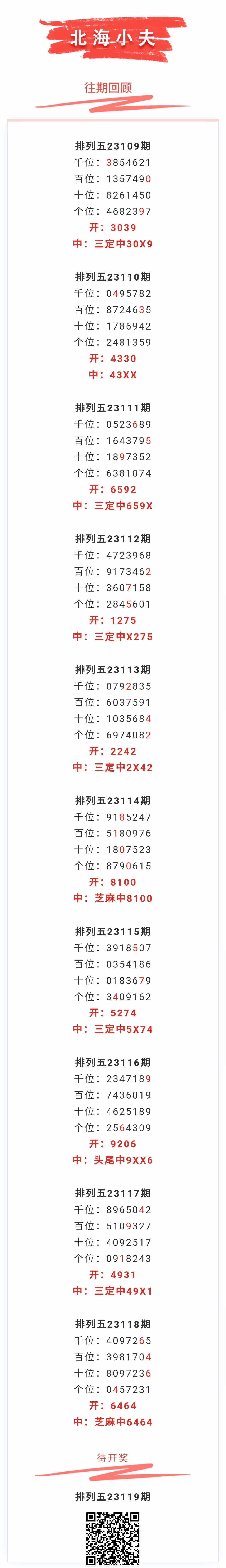 【排列五-119期】本月圈中2次芝麻,芝麻近10中2;上期芝麻中6464