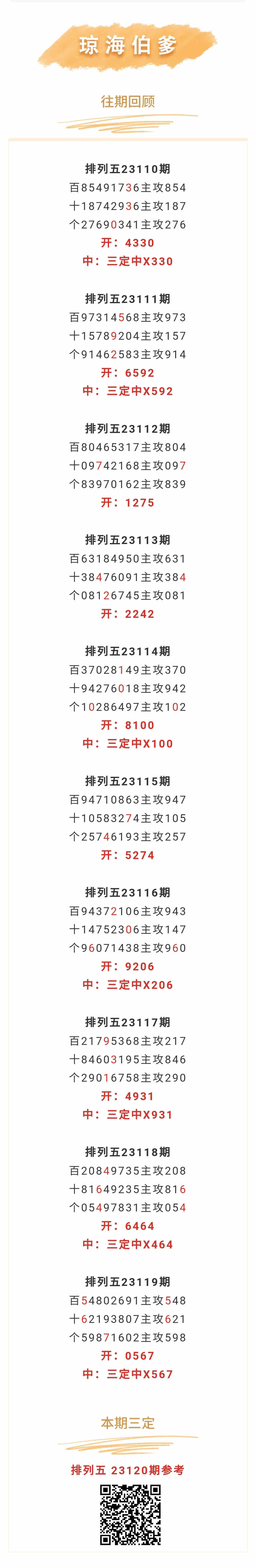 【排列五-120期】本月圈中6次三定,三定近10中7;上期三定中X567