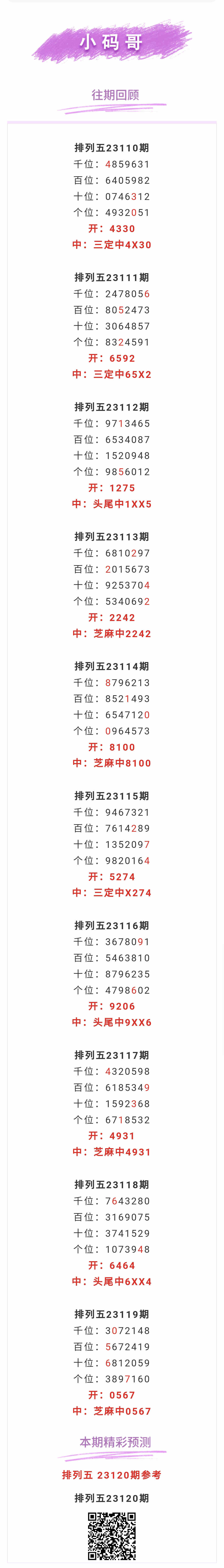【排列五-120期】本月圈中4次芝麻,芝麻近10中4;上期芝麻中0567