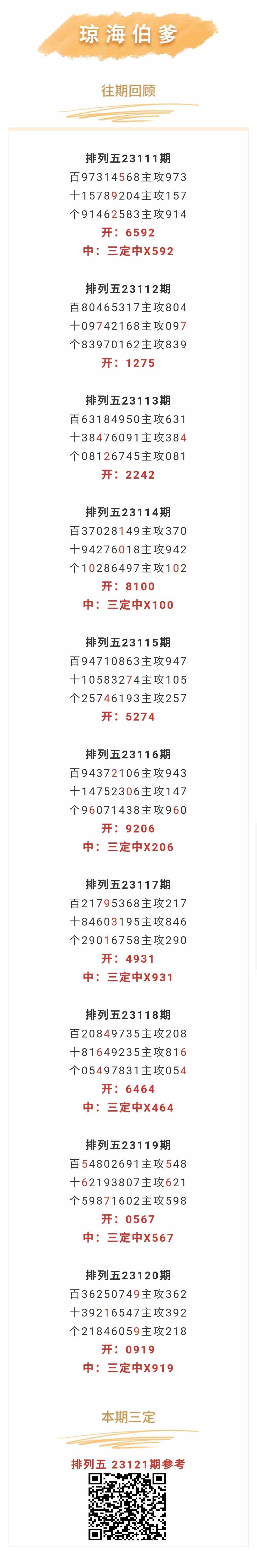 【排列五-121期】上期三定中X919;三定近10中7;本月圈中7次三定!