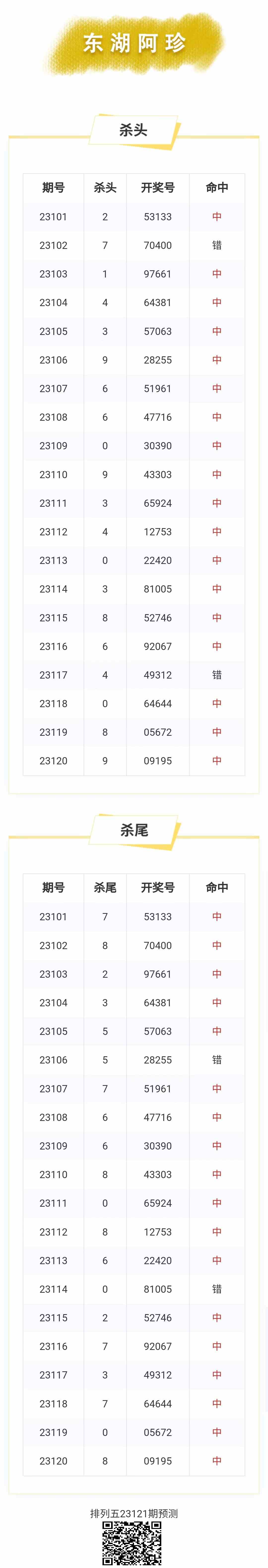 【排列五-121期】本月圈中8次杀头尾,杀头尾近10中8;上期杀头尾中