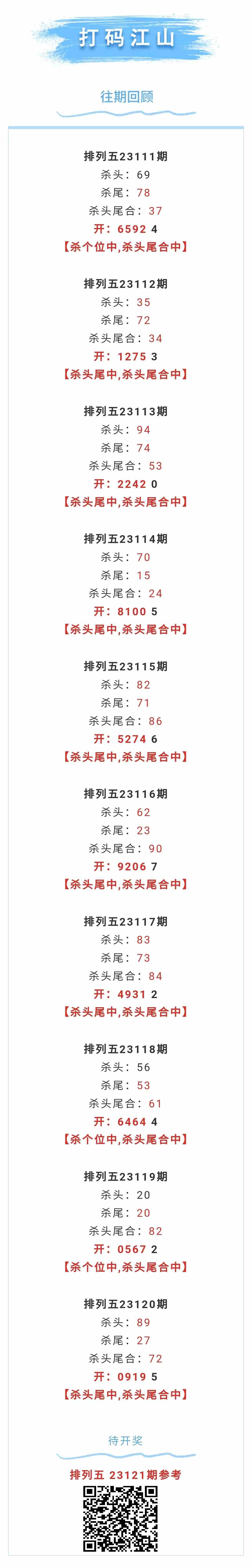【排列五-121期】本月圈中10次杀头尾合,杀头尾合近10中10;上期杀头尾中,杀头尾合中