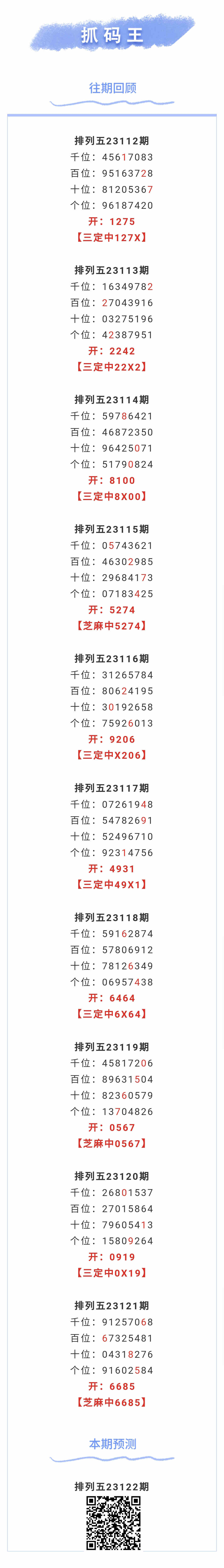 【排列五-122期】本月圈中3次芝麻,芝麻近10中3;上期芝麻中6685