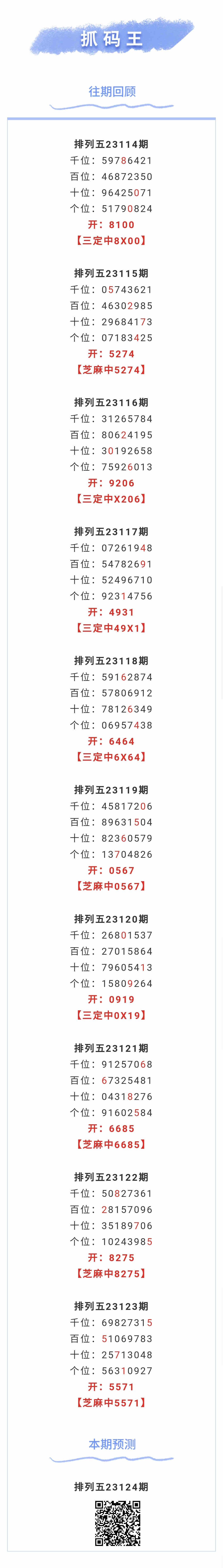 【排列五-124期】本月圈中5次芝麻,芝麻近10中5;上期芝麻中5571