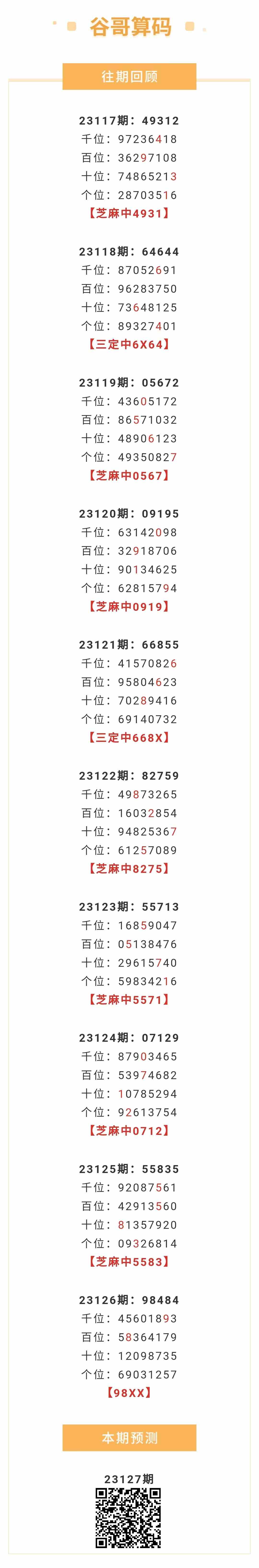 【排列五-127期】本月圈中10次芝麻,芝麻近10中7;上期98XX