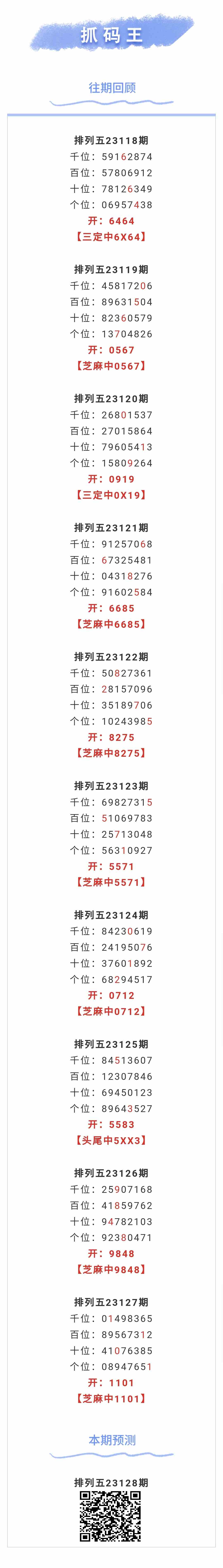 【排列五-128期】本月圈中8次芝麻,芝麻近10中7;上期芝麻中1101