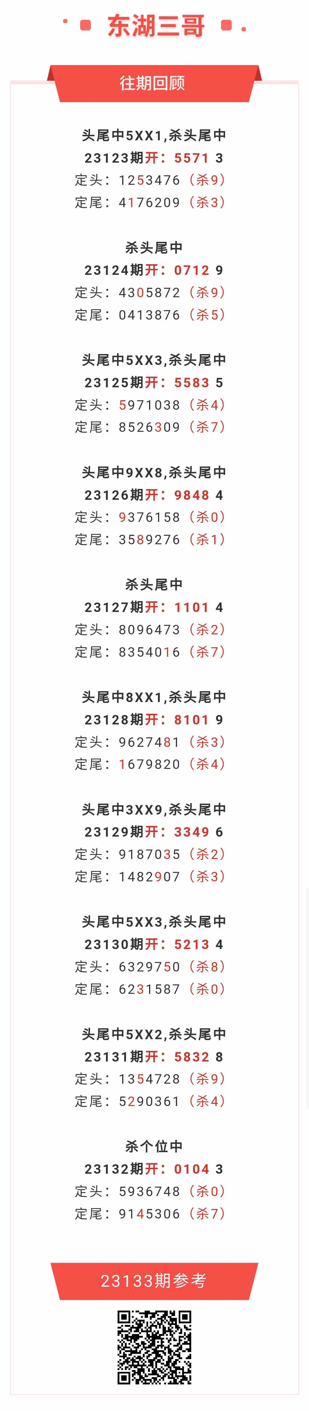 【排列五-133期】本月圈中14次头尾,头尾近10中7;上期杀个位中