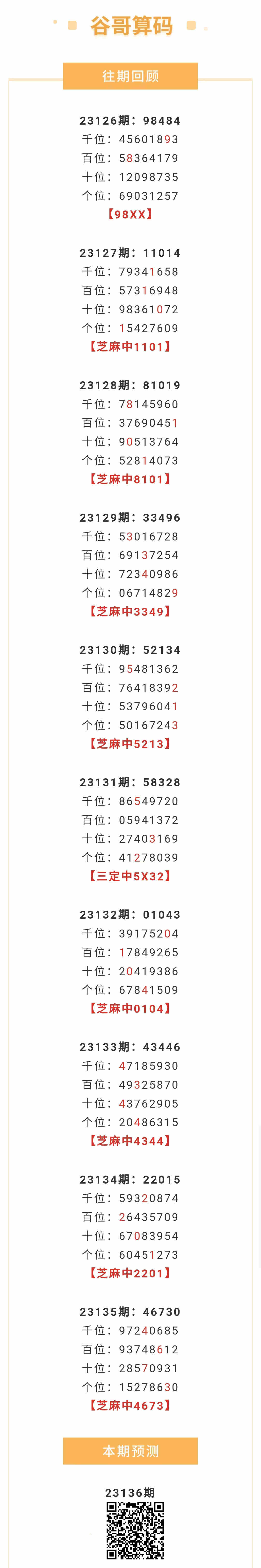 【排列五-136期】本月圈中18次芝麻,芝麻近10中8;上期芝麻中4673