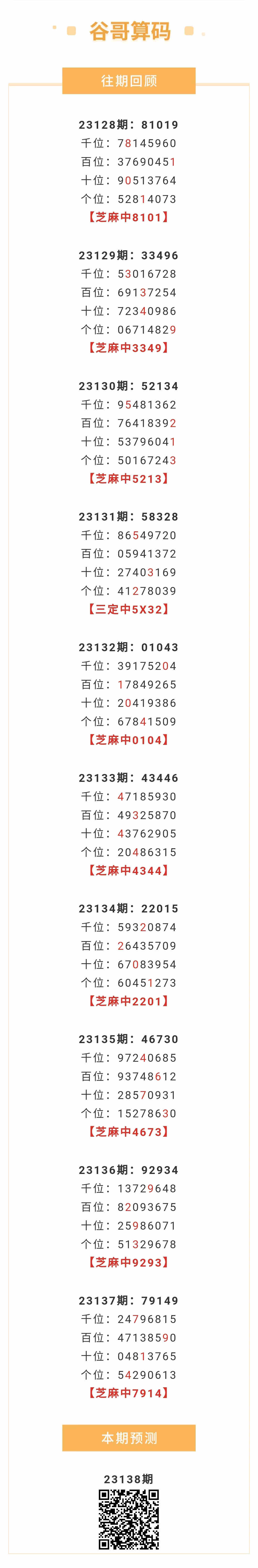 【排列五-138期】本月圈中20次芝麻,芝麻近10中9;上期芝麻中7914