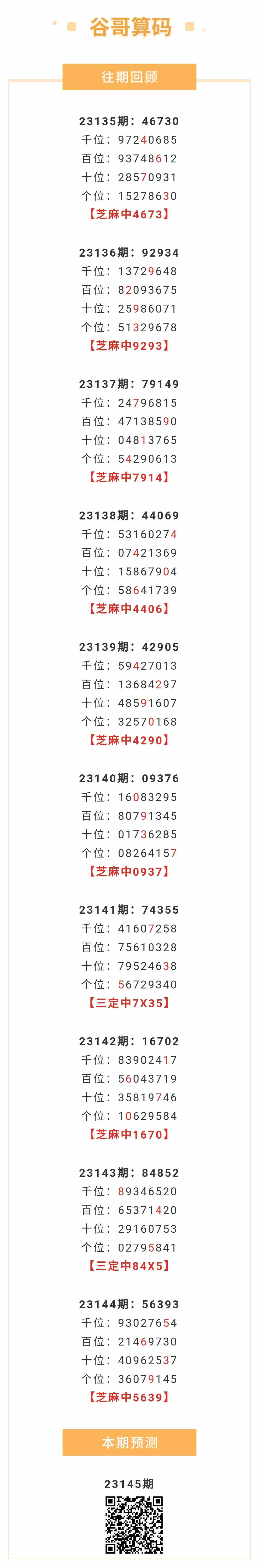 【排列五-145期】本月圈中2次芝麻,芝麻近10中8;上期芝麻中5639