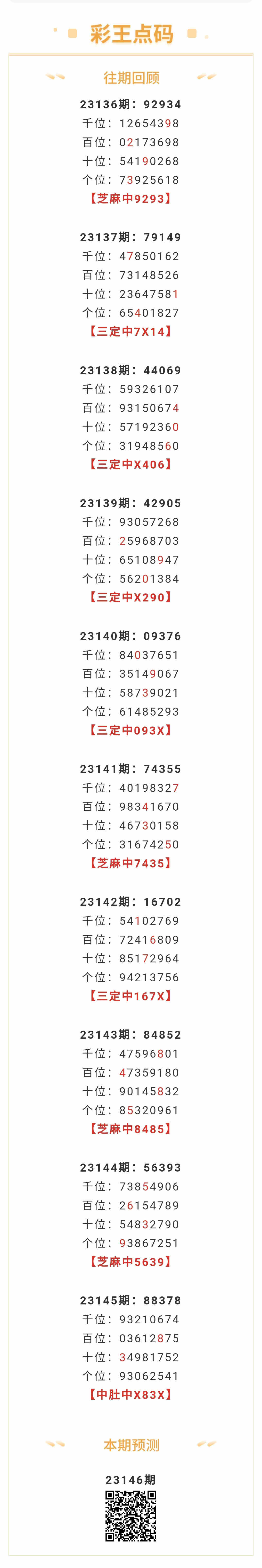 【排列五-146期】本月圈中2次芝麻,芝麻近10中4;上期中肚中X83X
