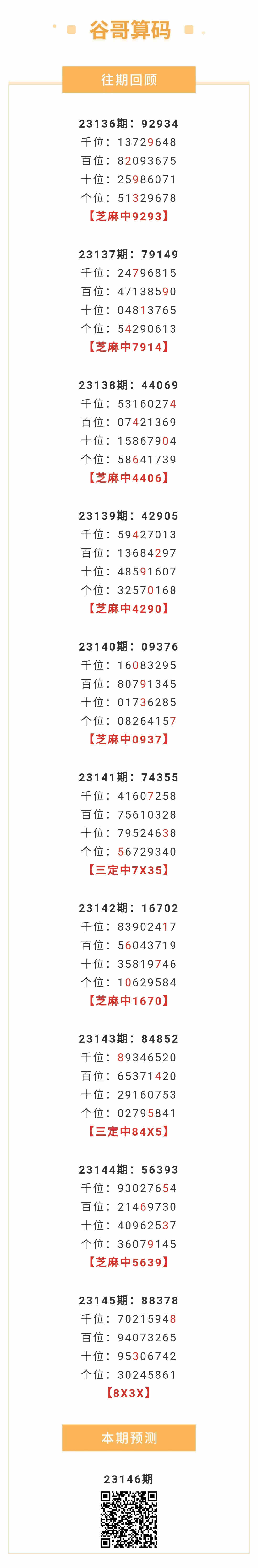 【排列五-146期】本月圈中2次芝麻,芝麻近10中7;上期8X3X