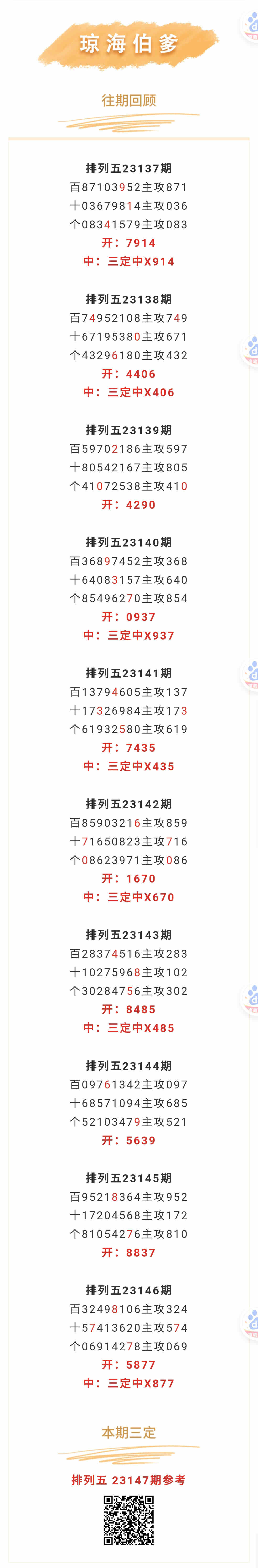 【排列五-147期】本月圈中3次三定,三定近10中7;上期三定中X877