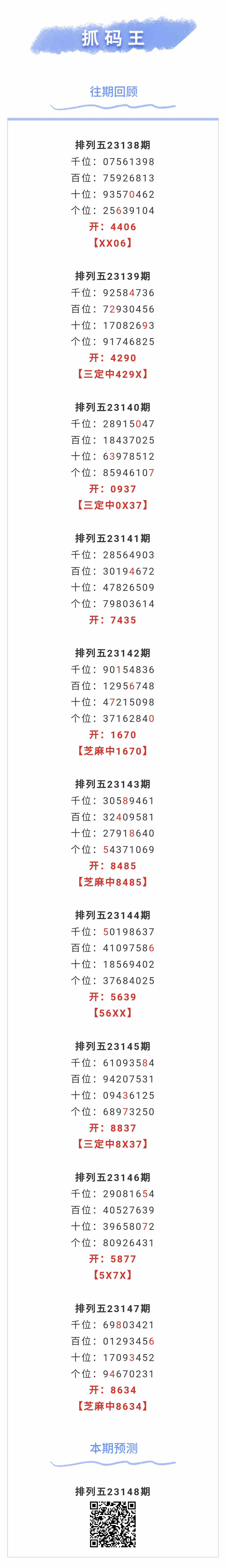 【排列五-148期】本月圈中3次芝麻,芝麻近10中3;上期芝麻中8634