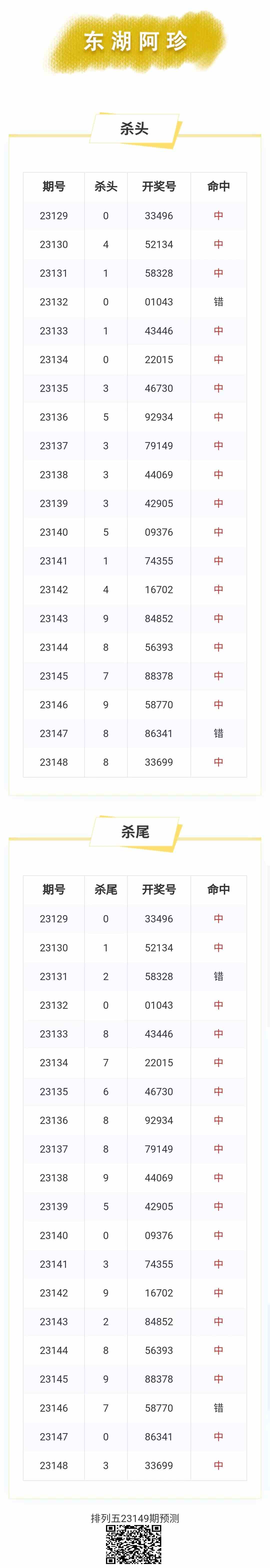 【排列五-149期】上期杀头尾中;杀头尾近10中8;本月圈中5次杀头尾!