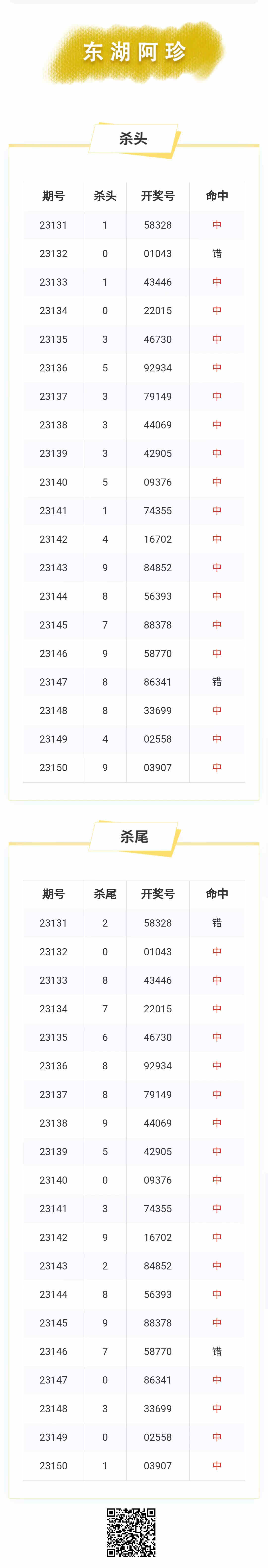 【排列五-151期】本月圈中7次杀头尾,杀头尾近10中8;上期杀头尾中