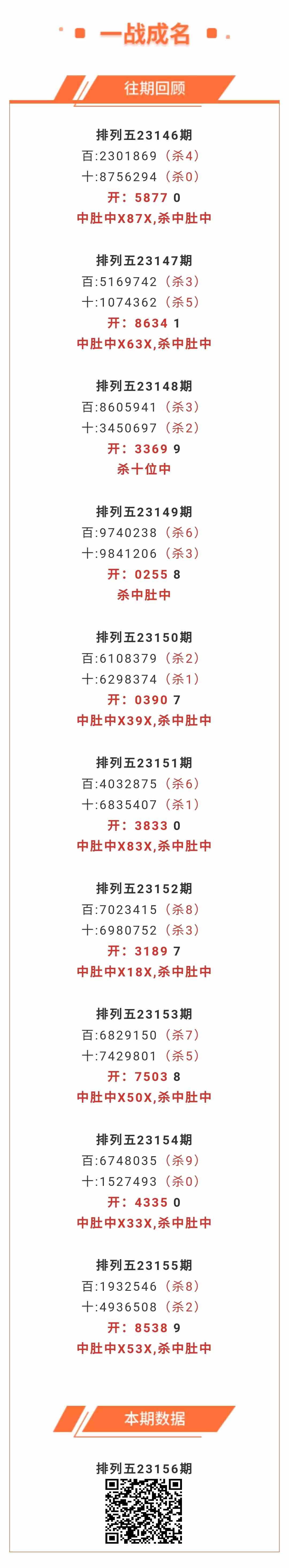 【排列五-156期】上期中肚中X53X,杀中肚中;中肚近10中8;本月圈中9次中肚
