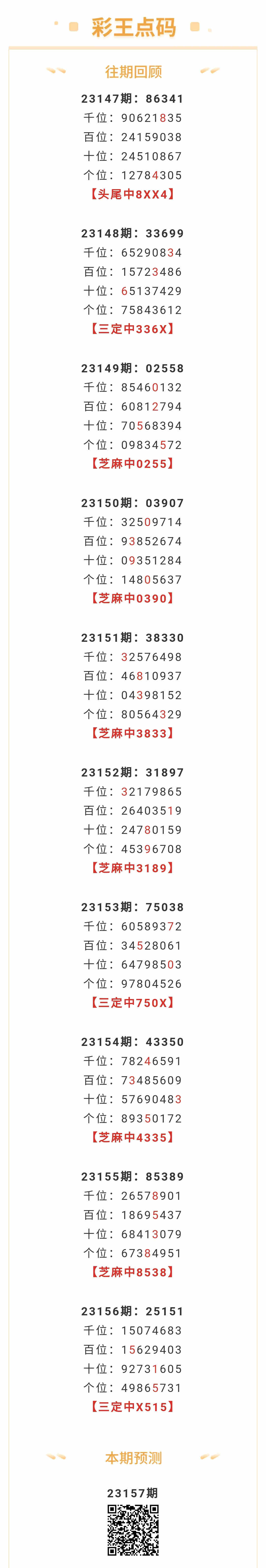 【排列五-157期】上期三定中X515,芝麻10中6,本月圈中8次芝麻