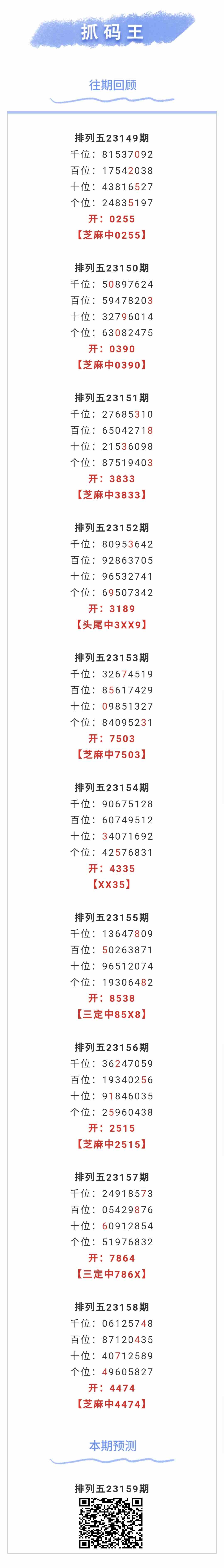 【排列五-159期】上期芝麻中4474;芝麻近10中6;本月圈中10次芝麻