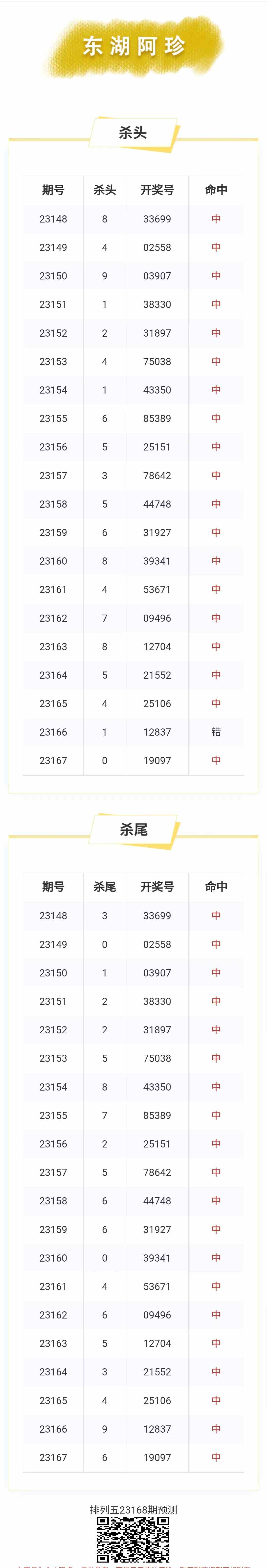 【排列五-168期】本月圈中23次杀头尾,杀头尾近10中9;上期杀头尾中