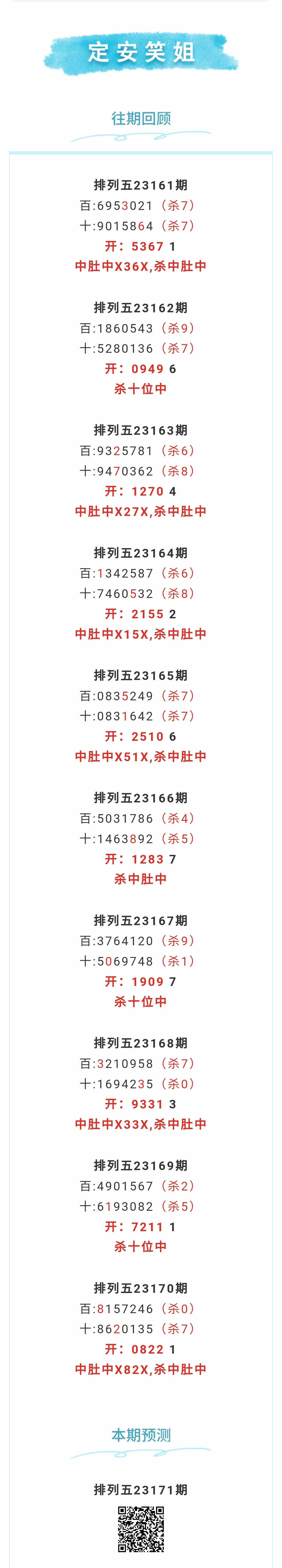 【排列五-171期】本月圈中16次中肚,中肚近10中6;上期中肚中X82X,杀中肚中