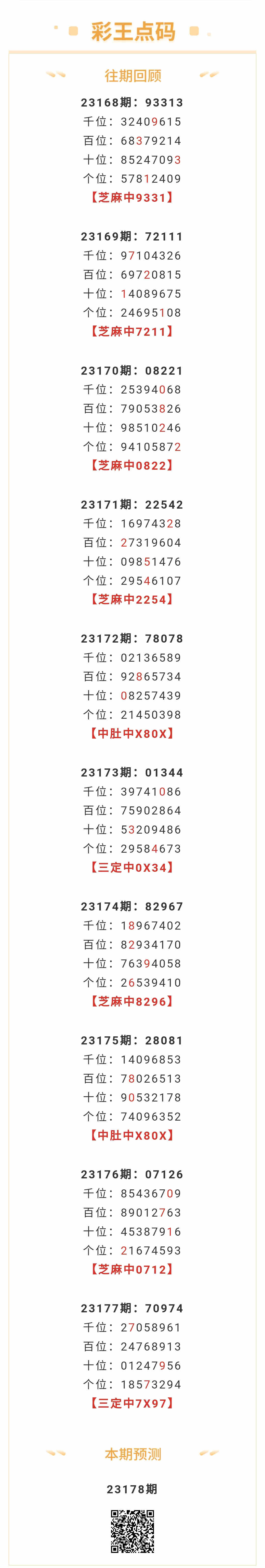 【排列五-178期】本月圈中2次芝麻,芝麻近10中6;上期三定中7X97