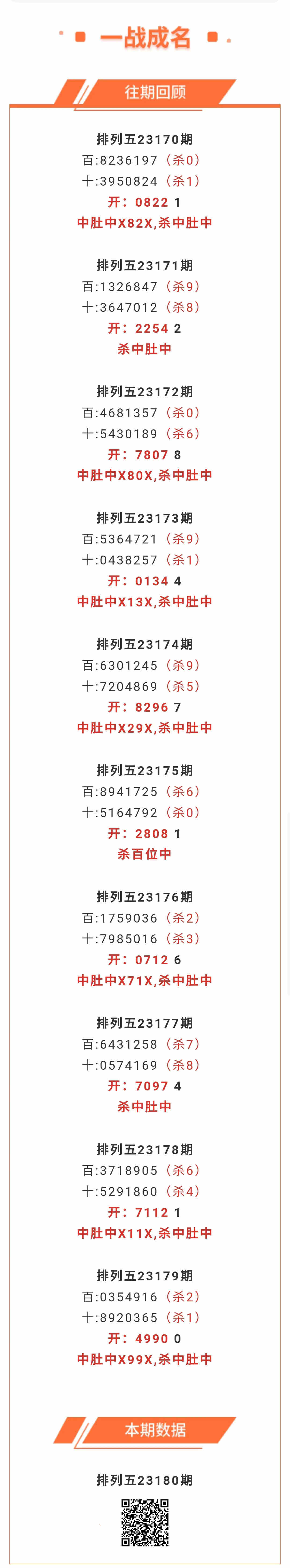【排列五-180期】本月圈中6次中肚,中肚近10中7;上期中肚中X99X,杀中肚中
