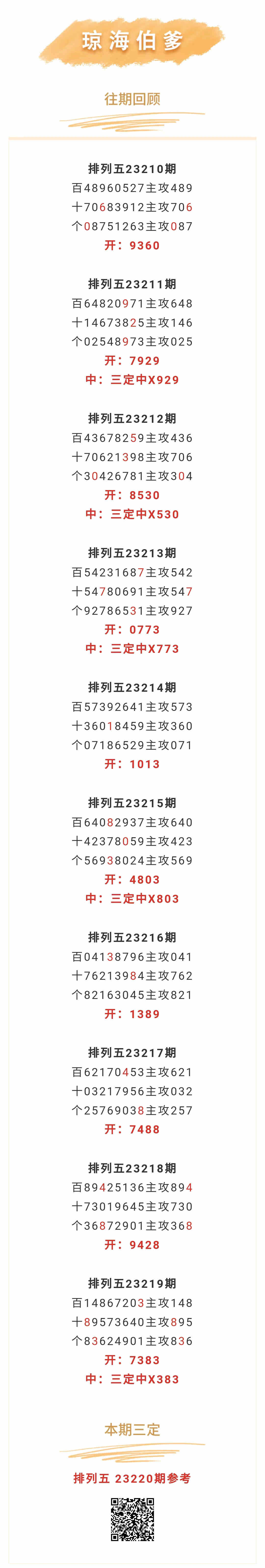 【排列五-220期】本月圈中8次三定,三定近10中5;上期三定中X383