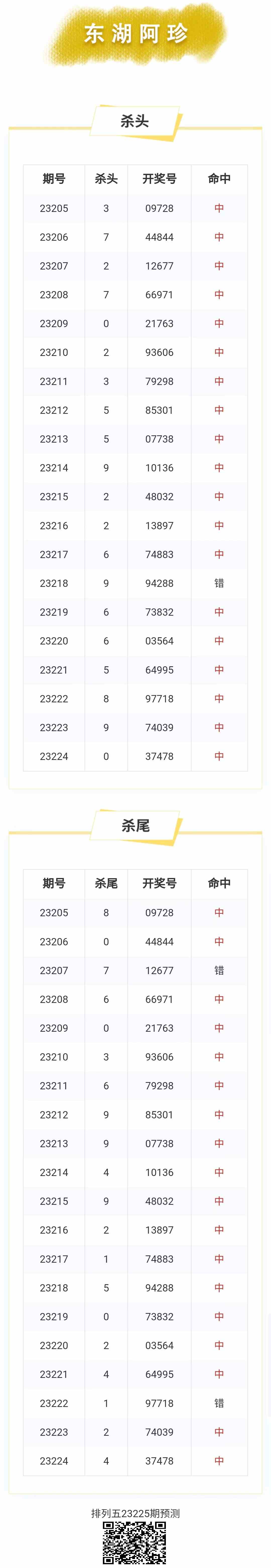【排列五-225期】本月圈中19次杀头尾,杀头尾近10中8;上期杀头尾中