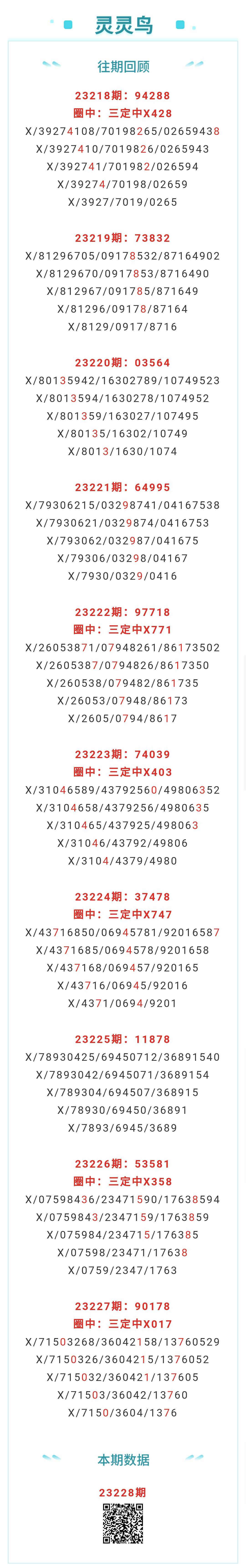 【排列五-228期】本月圈中13次三定,三定近10中6;上期三定中X017