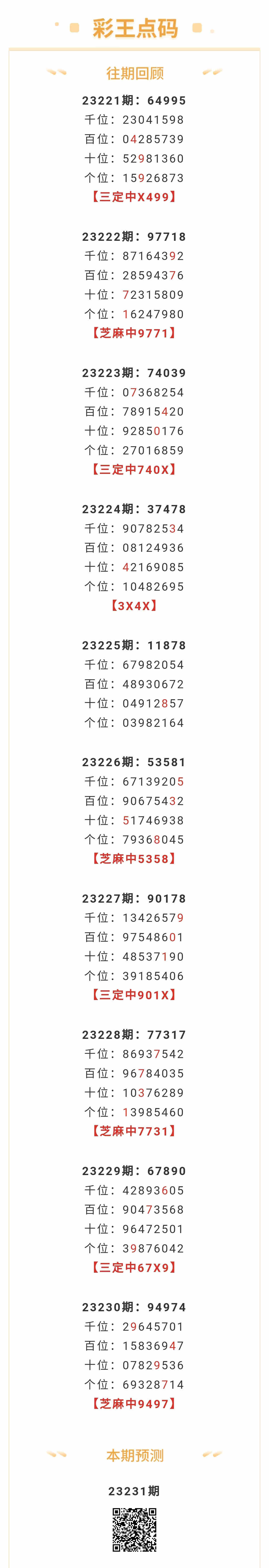 【排列五-231期】本月圈中14次芝麻,芝麻近10中4;上期芝麻中9497